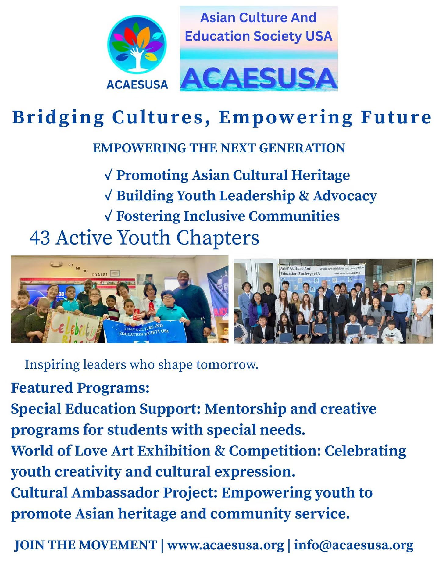 The Asian Culture and Education Society USA (ACAESUSA) envisions a future where diverse cultures are celebrated, young people are empowered to lead with confidence and compassion, and all communities—regardless of background or ability—have access to inclusive education, mental health support, and civic opportunity. We strive to build a more unified, equitable, and culturally rich society for generations to come.