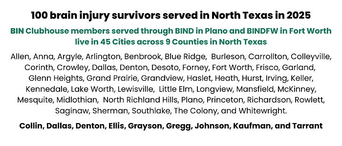 Brain Injury Network has two clubhouses, BIND in Plano and BINDFW in Fort Worth. BIN provides the only brain injury clubhouses in Texas and serves as an information resource for survivors and other nonprofits across the state.