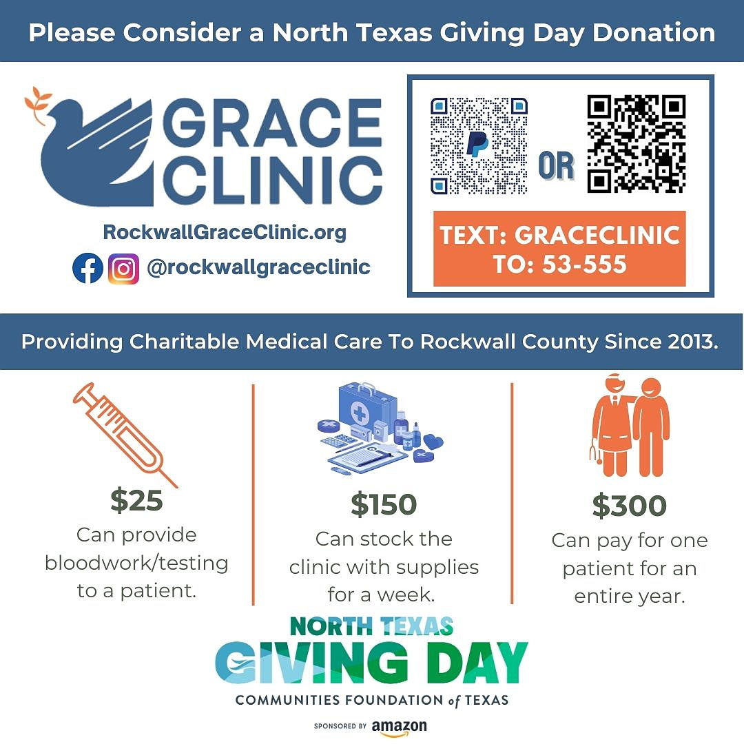 Grace Clinic is a Christian nonprofit healthcare clinic in downtown Rockwall. We provide quality medical care, mental health support, chronic disease management, cancer screenings, women's health services, health education and a community garden to families in Rockwall County and surrounding areas. Grace Clinic offers a sliding scale to ensure that those facing financial hardship can access quality healthcare while empowering patients with the knowledge and resources they need to build healthier, more stable lives.