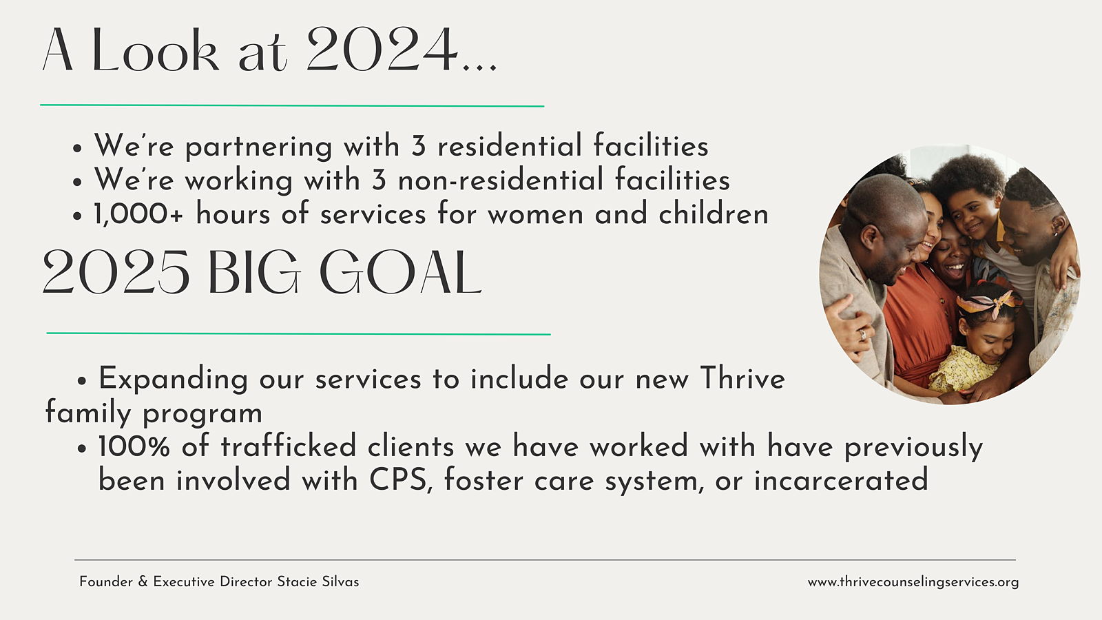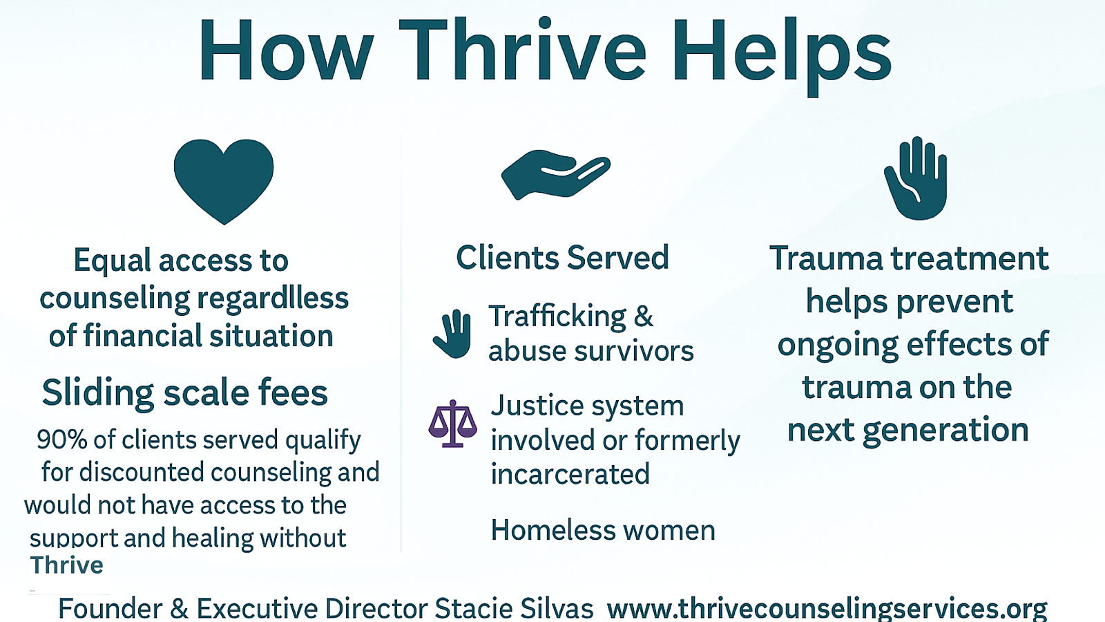 Since 2019, Thrive has provided more than 5,000 hours of faith-based, professional counseling services to individuals and families that otherwise could not afford or access mental health services!