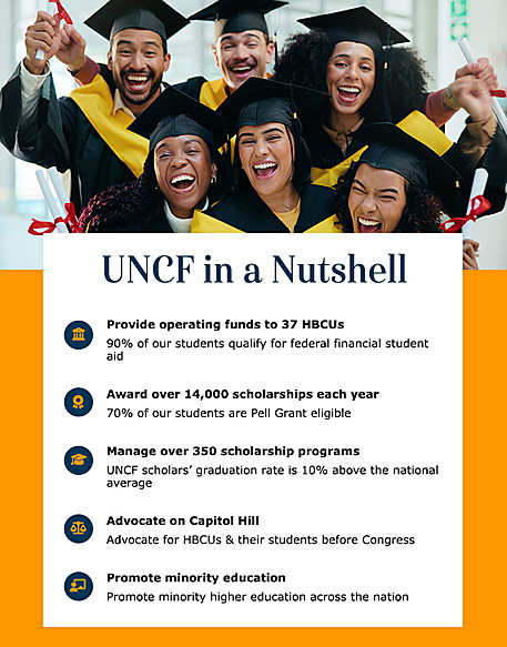 Since 1944, UNCF has expanded educational access and opportunity for students attending HBCUs and other mission-driven institutions. UNCF helps students, many of whom are first-generation, to earn degrees that change the economic trajectory of entire families and communities. UNCF's work ensures talented students--regardless of background--can succeed in college and beyond.