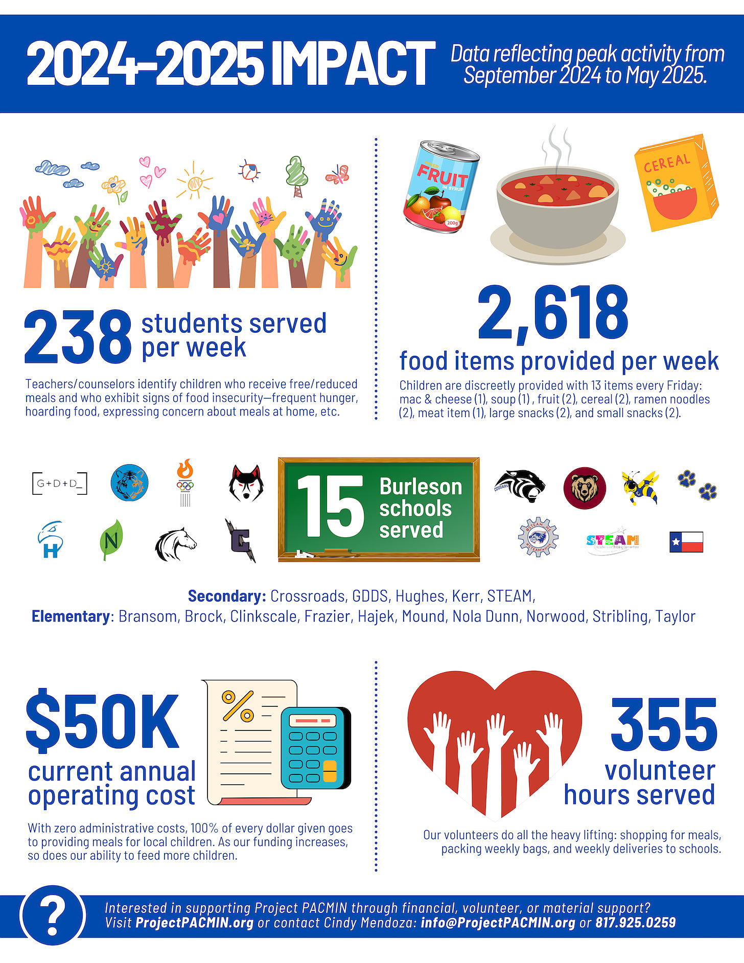 I am a volunteer board member for Project PACMIN. Since 2006, we’ve been feeding economically disadvantaged children on the weekends, ensuring they don’t go hungry when school meals aren’t available. What began at First United Methodist Church of Burleson as a simple “kids feeding kids” program has grown far beyond what we imagined. In our first year, we served just 50 children—by 2024, that number grew to 238 per week across 15 schools in the Burleson Independent School District. This growth reflects both the need and the heart of our community. And while we’ve come a long way, there’s still much work to be done.