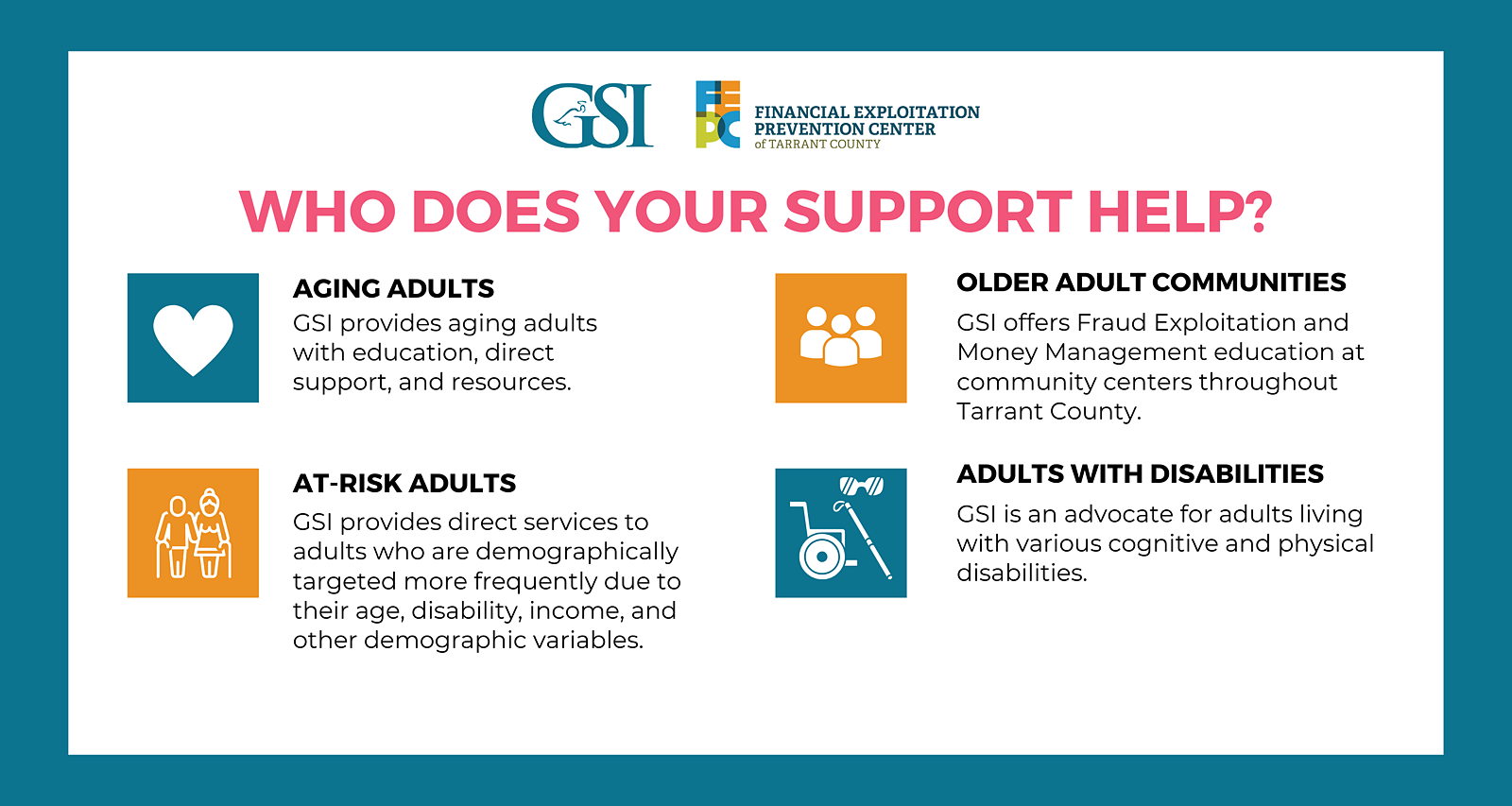 Your gifts to Guardianship Services, Inc. protect aging Tarrant County residents and adults living with disabilities from abuse, neglect and exploitation.