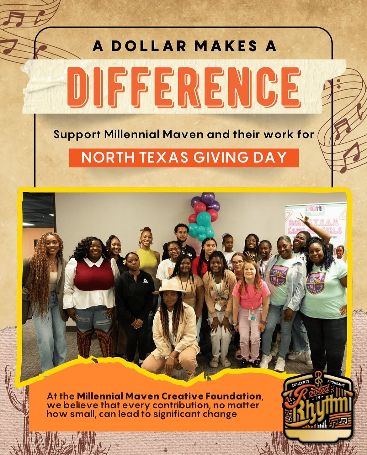 At the Millennial Maven Creative Foundation, we believe that every contribution, no matter how small, can lead to significant change. This North Texas Giving Day, we invite you to join our “Dollar Makes a Difference” campaign to support aspiring creatives in our community.