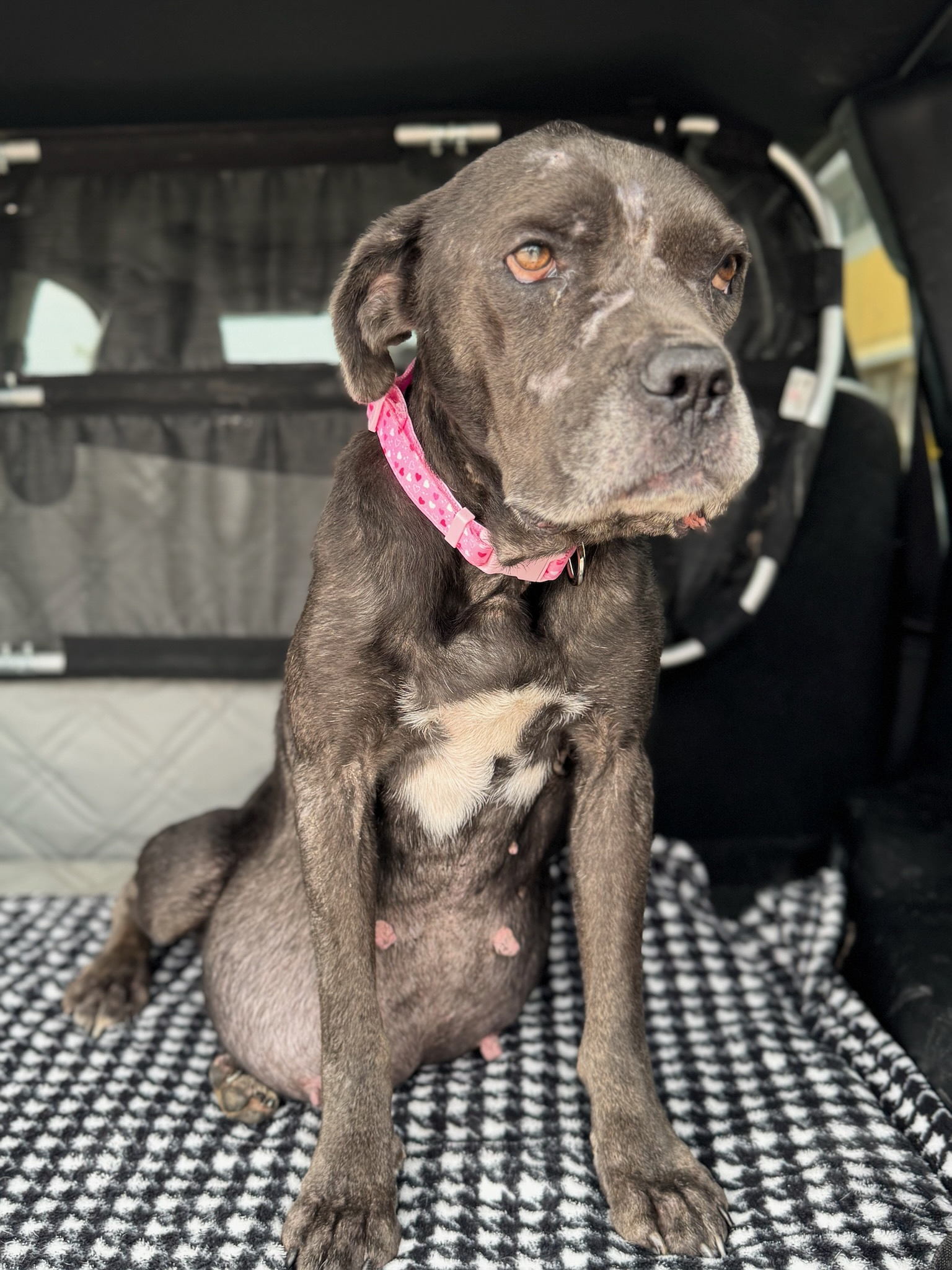 Our vet partner, Vickery Place Animal Hospital, tapped her abdomen and removed over 1.5 liters of fluid to help her breathe and move more comfortably. This gentle girl wagged her tail through it all, soaking up love despite the pain she’s endured. Right now, Magnolia Mae is responding to treatment and has already had more fluid drained to keep her comfortable. The road ahead is uncertain — she may need lifelong medication, and depending on her diagnostics, she could be considered a fospice pup.